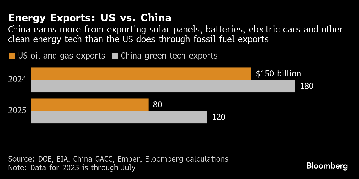 The US, which has positioned itself as a major fossil fuel exporter, sold $80 billion in oil and gas abroad through July, the last month with data available. China exported $120 billion in green technology over the same period.