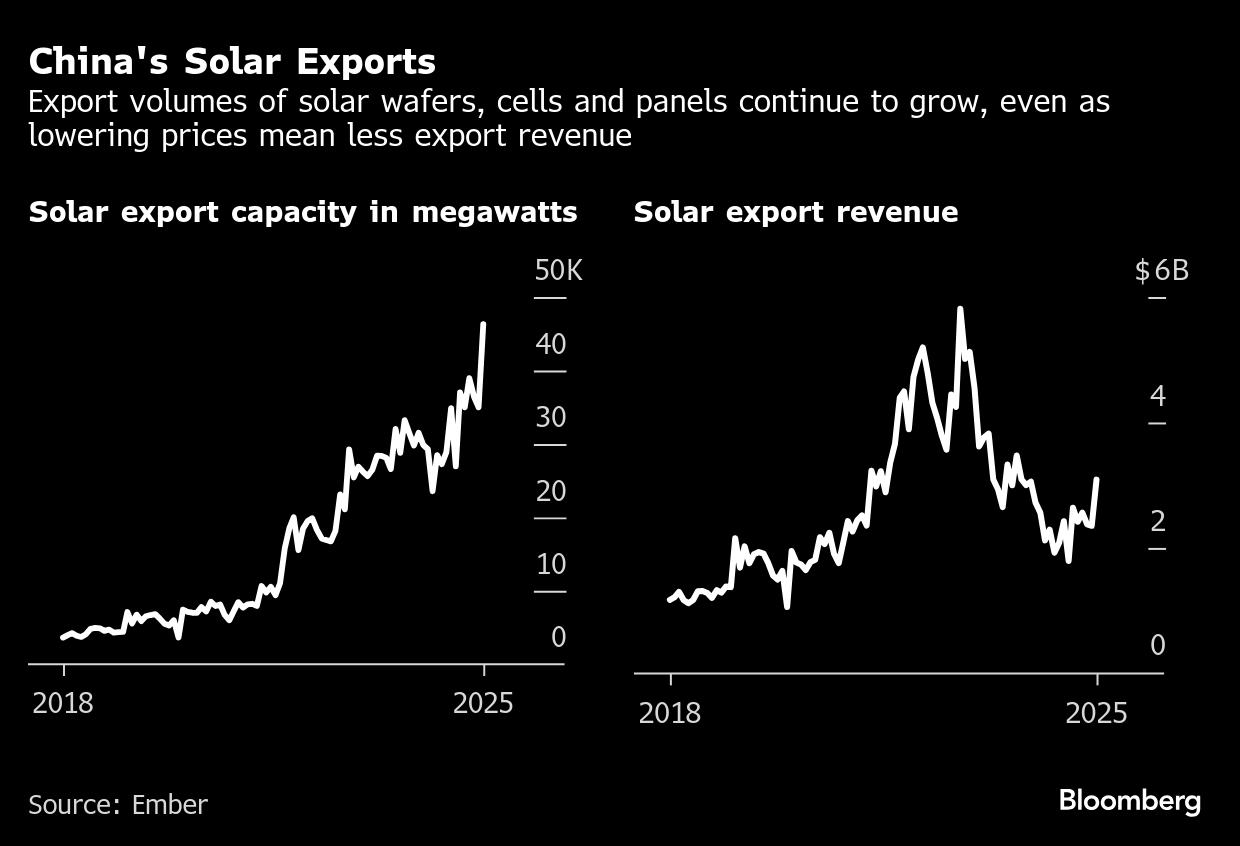 Dollars only tell part of the story. The price of solar panels is falling, which means that China is exporting more of them per dollar earned. August’s solar export revenue was nowhere near the high set in March 2023. But the 46,000 megawatts of power capacity shipped abroad set a record.
