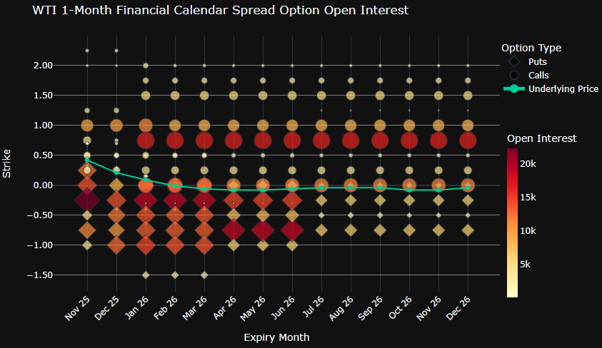 WTI calendar spread option open interest is more than 1.5 million lots — the equivalent of 1.5 billion barrels — including both physically and financial settled contracts, narrowing the gap to CME’s benchmark light sweet crude options total of nearly 2.3 million. A year ago the CSOs were less than one-fifth the size of the outrights.