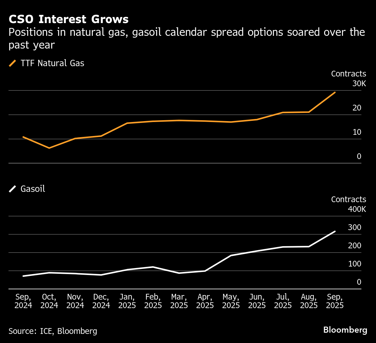 Calendar spread options — which bet on the difference between contracts expiring in different months — have seen a surge in trading to record levels in some markets. Positions in West Texas Intermediate crude have more than tripled over the past year, while Dutch natural gas curve bets have grown nearly as much.
