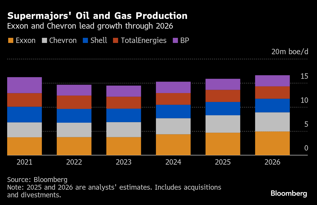 Exxon Mobil Corp., Chevron Corp., Shell Plc, BP Plc and TotalEnergies SE will likely grow output 3.9% this year and 4.7% in 2026, according to analysts’ estimates compiled by Bloomberg. The increases — which include new projects as well as acquisitions — appear designed to capitalize on an expected oil-price upturn in the latter half of next year.