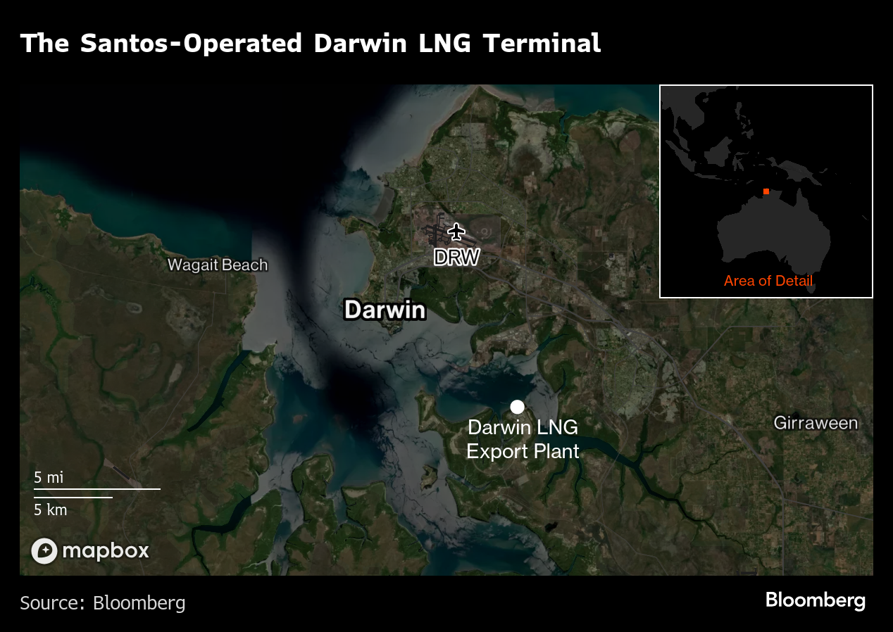 Santos operates Darwin LNG and owns about 43% of the venture. The other shareholders in the venture are SK Innovation E&S, Inpex Corp., Eni SpA, Jera Co. and Tokyo Gas Co.