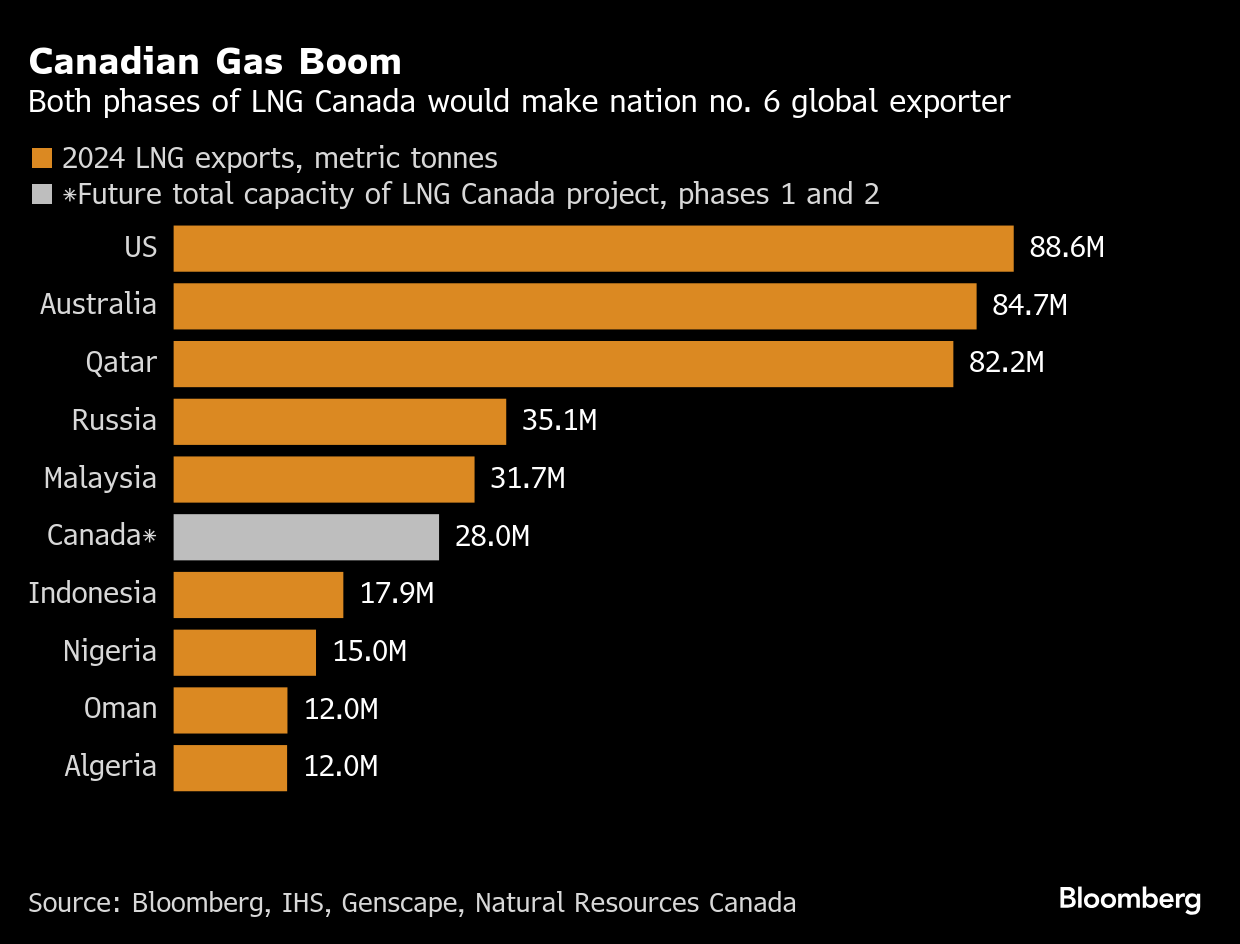 LNG Canada represents tens of billions of dollars in investment and is one of the largest private-sector projects in Canadian history. If the second phase is built and fully utilized, it would make Canada the sixth-largest LNG exporting nation based on 2024 figures, according to data compiled by Bloomberg. That’s without any other LNG export plants being considered.