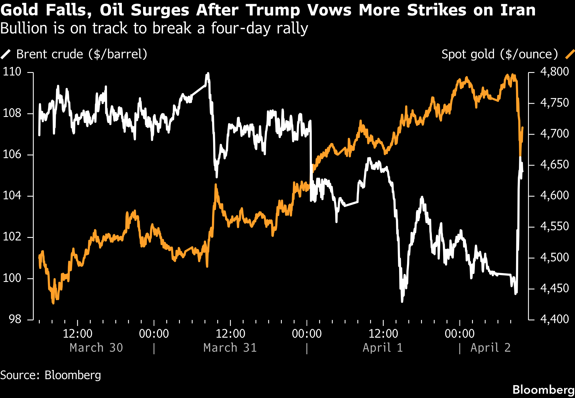 Trump’s speech “basically framed the conflict as a military success story, not a ceasefire announcement,” said Christopher Wong, a strategist at Oversea-Chinese Banking Corp. While gold earlier edged up to about $4,800 an ounce, “the momentum may moderate given the possible curtailment of risk appetite on fears of a US ground operation in Iran.”
