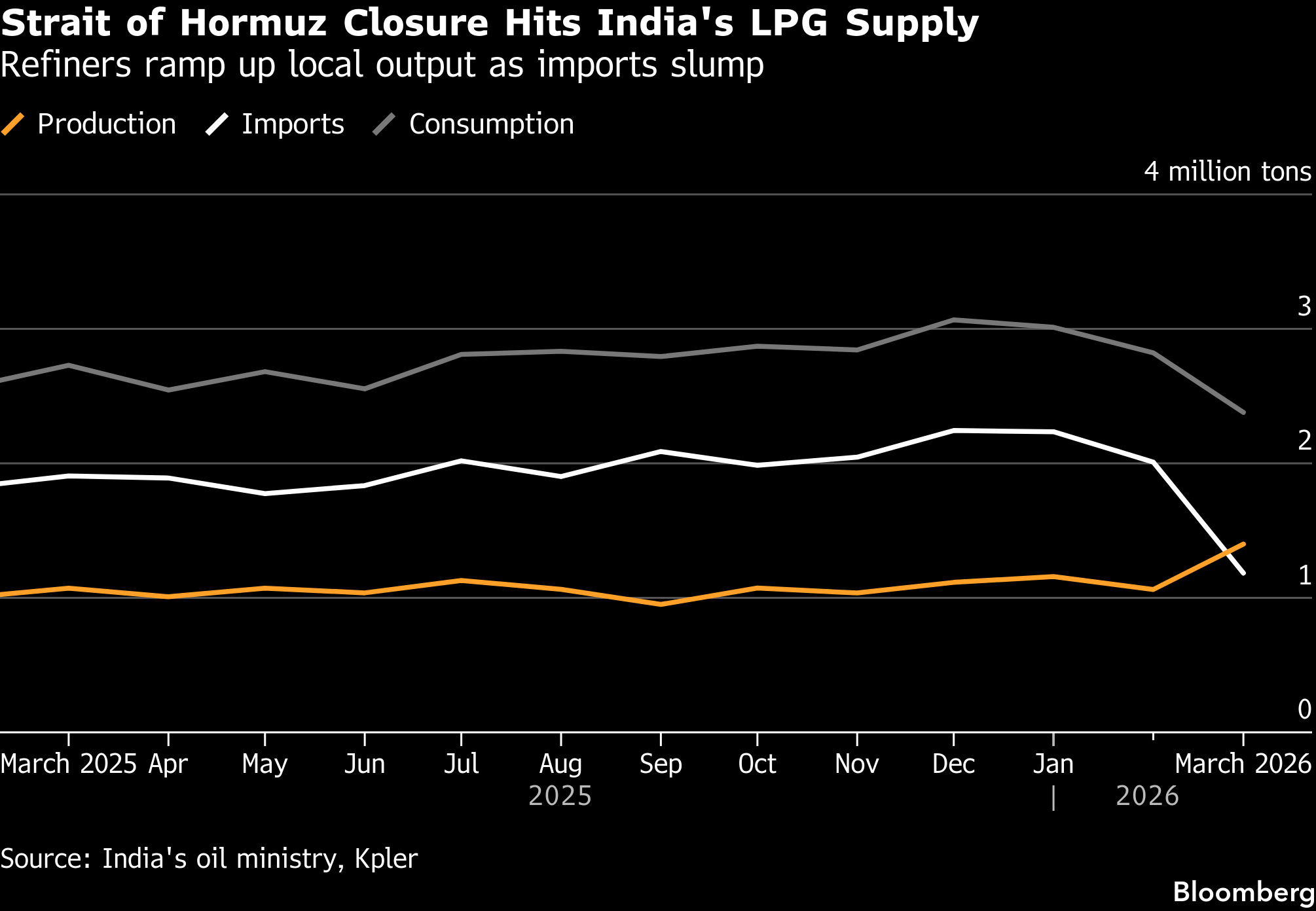 (Bloomberg) -- India’s government is leaning on its refineries to survive an acute shortage of cooking gas as the war in Iran drags on, while also scouring the world for additional suppliers and nudging consumers toward alternatives.