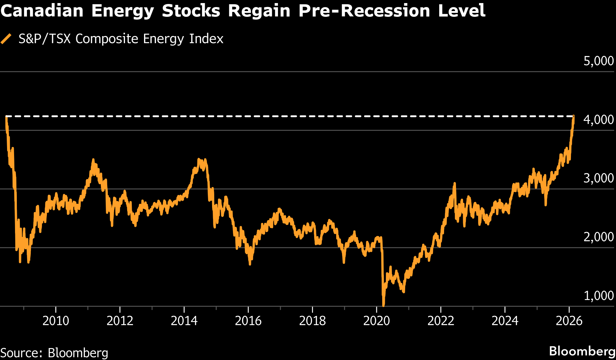 (Bloomberg) -- Canadian energy shares had their first record close in nearly eighteen years, helped by rising oil and natural gas prices and a return of investor interest in the sector.