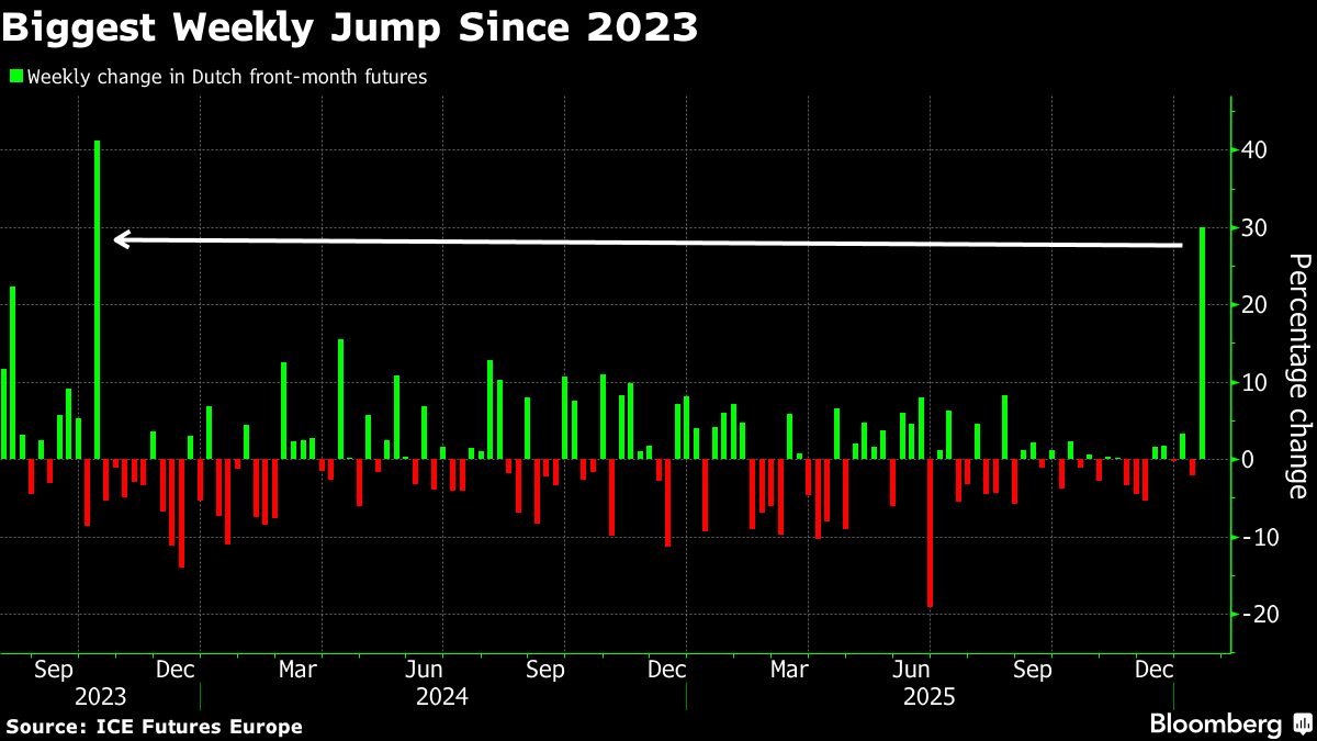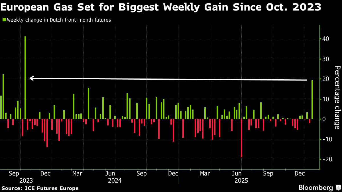 Geopolitical risks and speculative flows are amplifying the move, said James Waddell, head of European gas and global LNG at Energy Aspects Ltd. Cold weather in Europe and Asia, low stocks and renewed tensions involving Iran have lifted risk premiums, while traders have been forced to unwind short positions built on expectations of a swift return of Russian gas, he said.