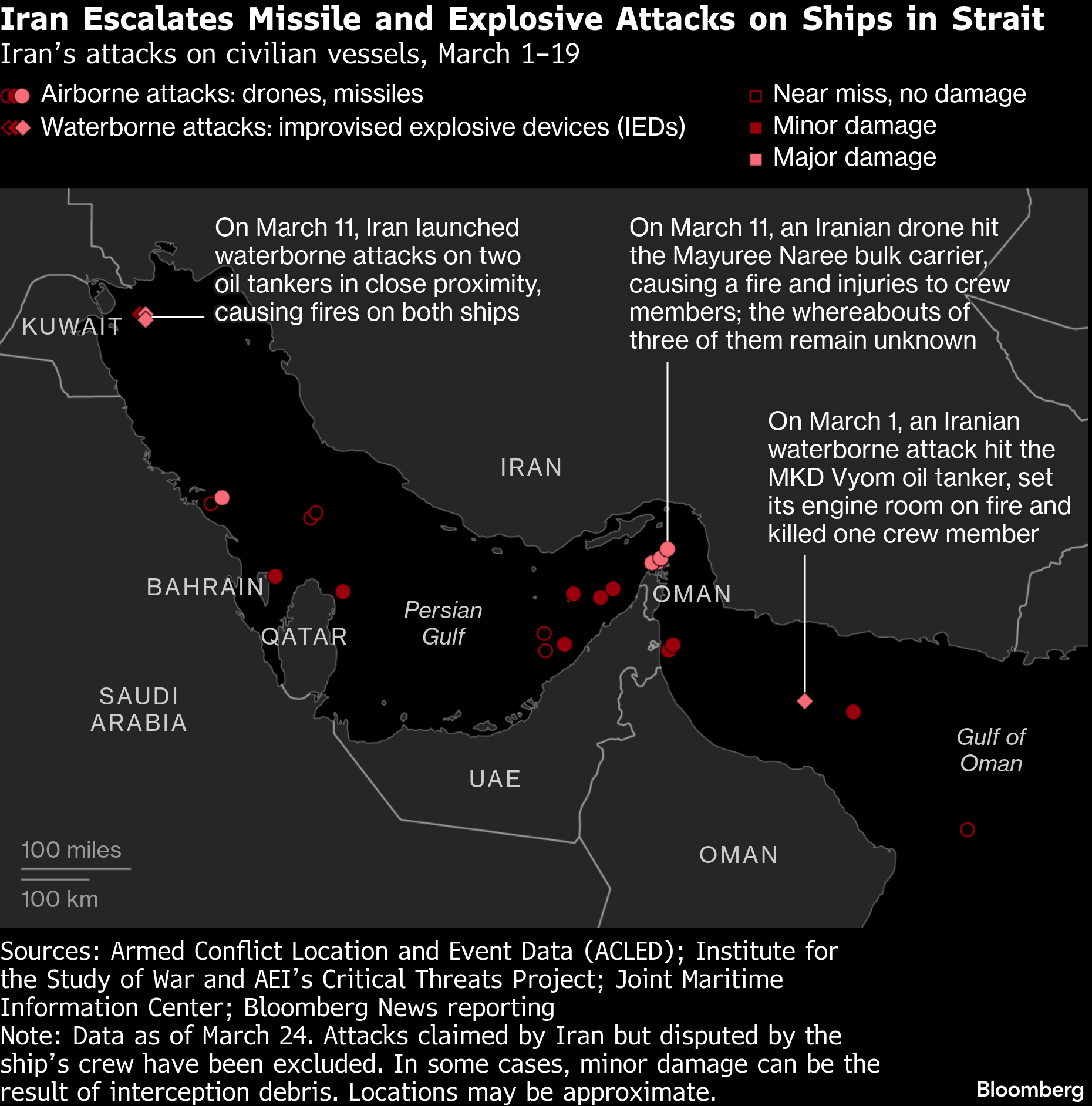 So far in March, the first full month of war, barely six vessels per day on average have traversed the narrow waterway connecting the Persian Gulf to the world, in either direction. That compares with about 135 a day in normal times, according to ship-tracking data compiled by Bloomberg.