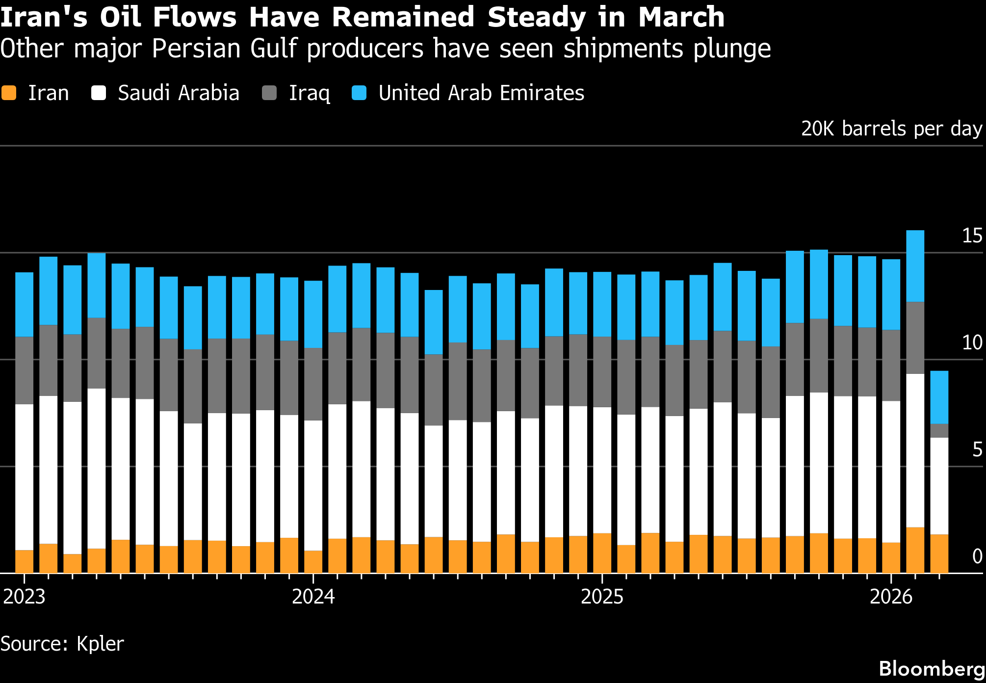 In contrast, exports over the same month from Iraq, situated deep in the Persian Gulf, plunged more than 80% compared to 2025 levels, while Saudi Arabia was more than a quarter below last year’s average — even with the help of a pipeline carrying its oil to the Red Sea.
