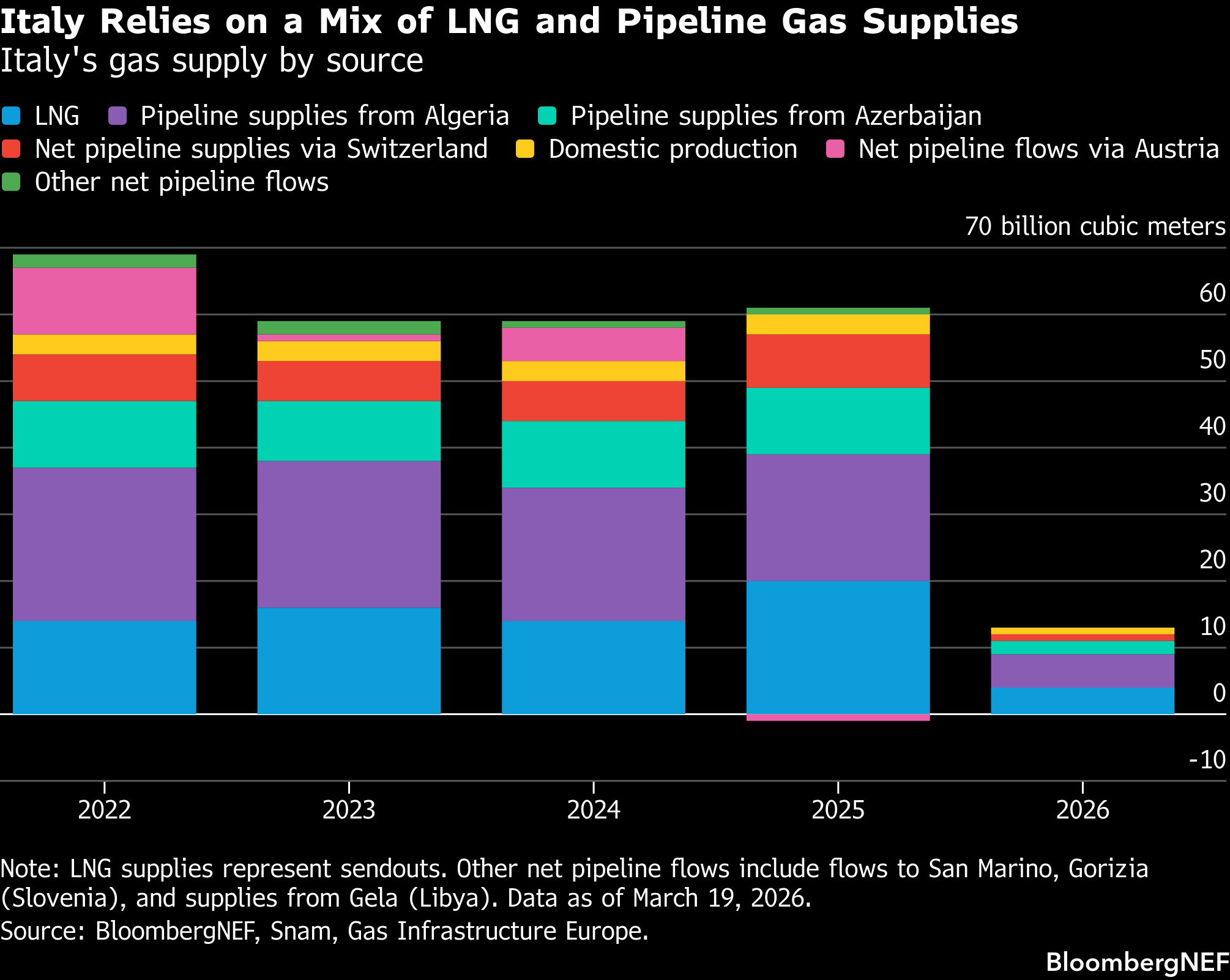 Flows from Algeria via the TransMed pipeline have averaged about 20 billion cubic meters in recent years, roughly 2 billion a year below 2022-2023 levels, according to Italian Energy Ministry data. A return to those levels would still be insufficient to replace lost LNG volumes from Qatar, according to BloombergNEF.