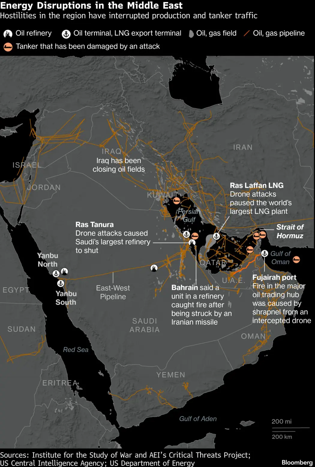 The reductions add to the list of energy supply cuts in countries across the Persian Gulf, which have helped drive oil prices in London to the highest close in more than two years at almost $93 a barrel. Iraq started holding back production earlier this week as the near-halt of shipments through Hormuz started filling up storage tanks, while Saudi Arabia shut its biggest refinery and Qatar closed the world’s largest liquefied natural gas export plant after drone attacks.