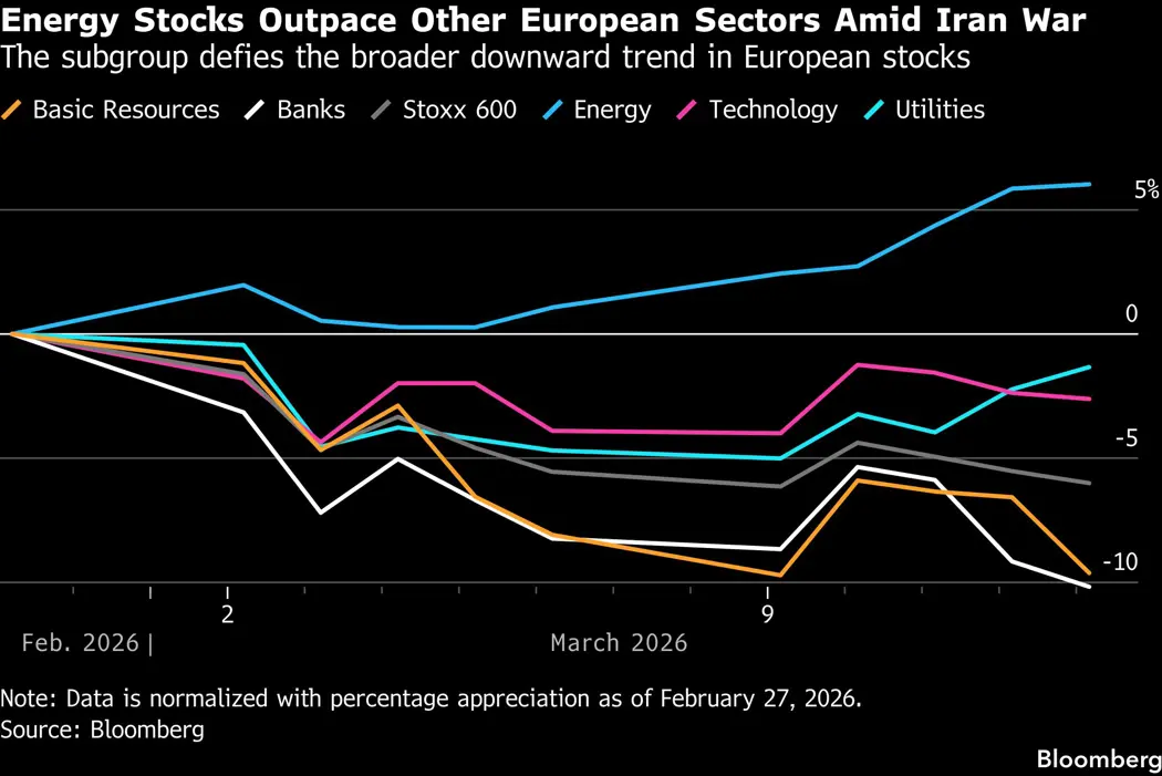 (Bloomberg) -- The war in the Middle East is causing unprecedented turmoil in oil markets, supercharging shares in European energy companies that are expected to benefit from higher prices and turning other stocks into laggards.