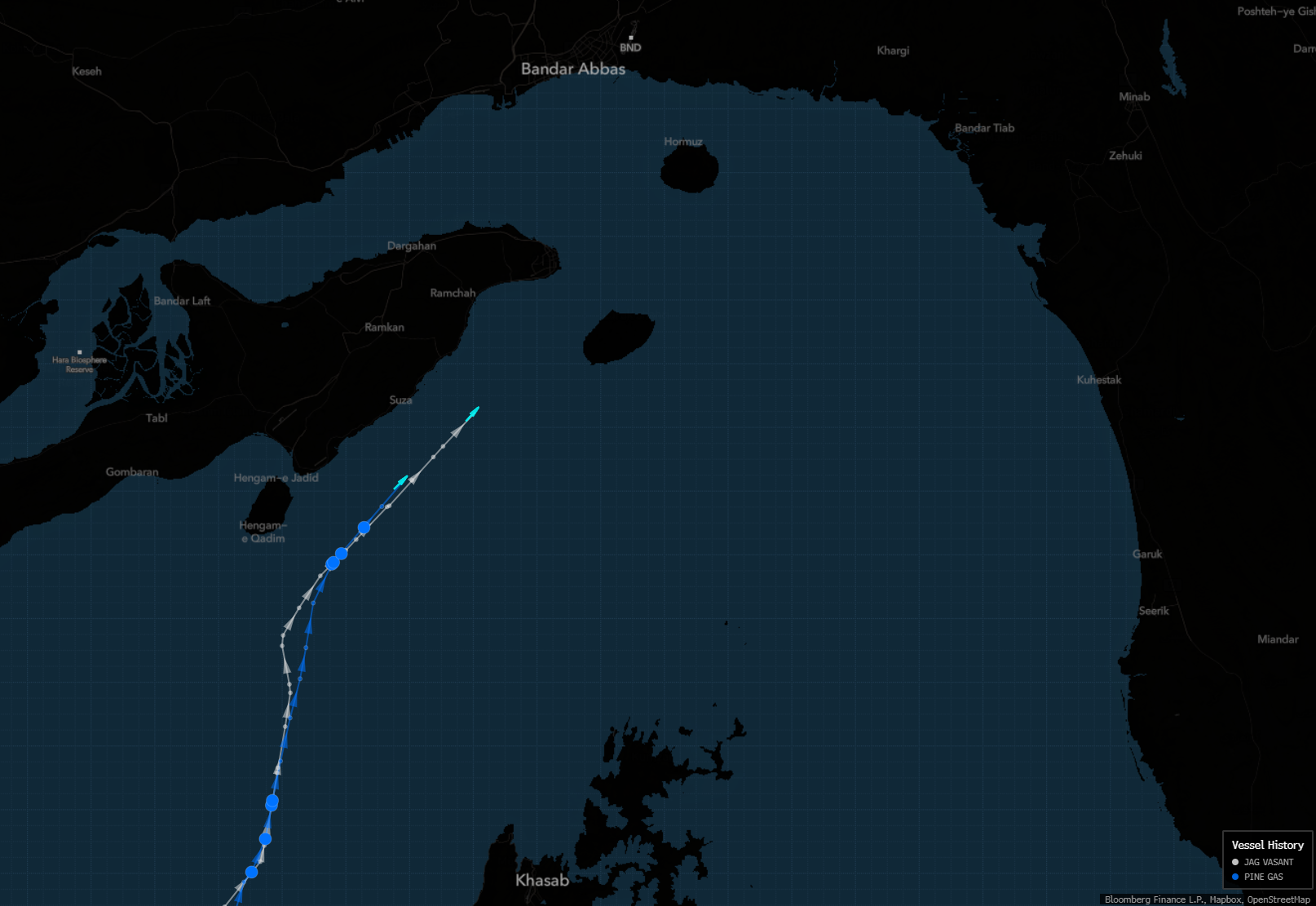 A full Hormuz transit can take up to 14 hours. If Jag Vasant and Pine Gas continue on their current trajectory unhindered, they are likely to reach the other side of the strait in the Gulf of Oman by Monday evening.