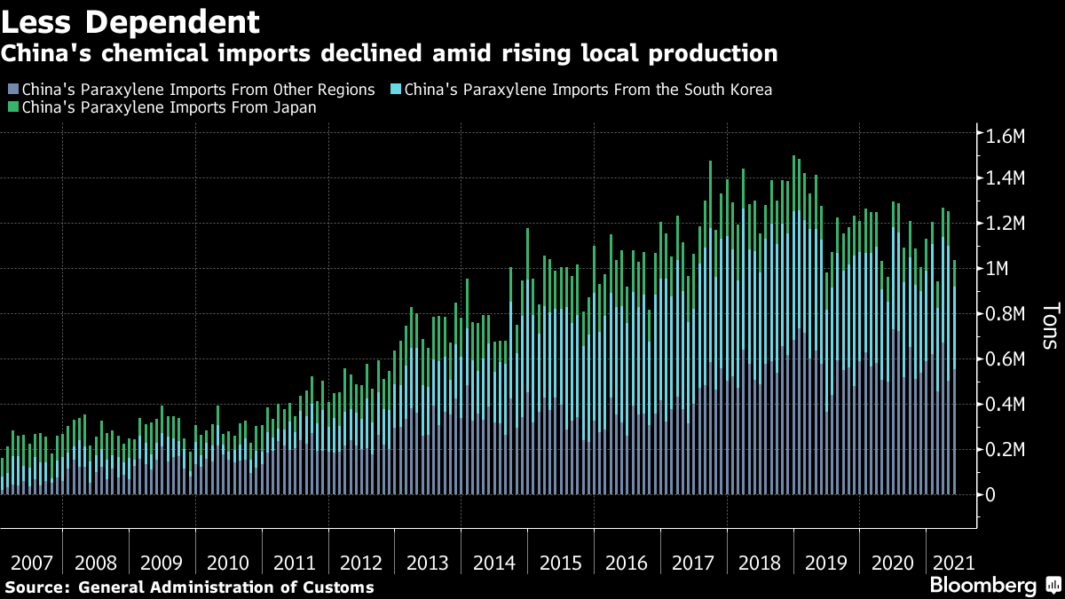 Companies like Hengli in the past spent billions on buying chemicals like paraxylene overseas for their massive fiber production. But that’s changing as teapot firms produce more of the chemical at home, hitting suppliers in South Korea, Singapore and Taiwan.