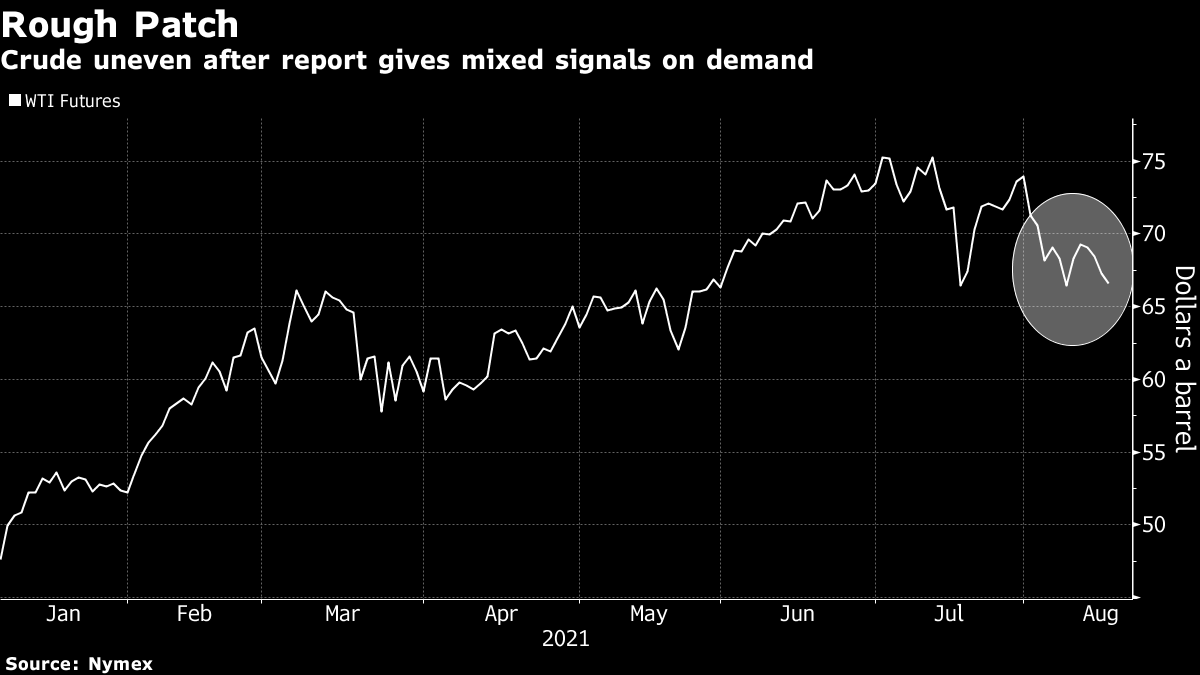 West Texas Intermediate ticked higher by 16 cents after a four-day losing streak stalled this year’s crude rally. The advance was tempered by a surprise jump in gasoline stockpiles that signaled fuel demand may be under threat as Covid-19’s delta variant menaces the economic recovery.