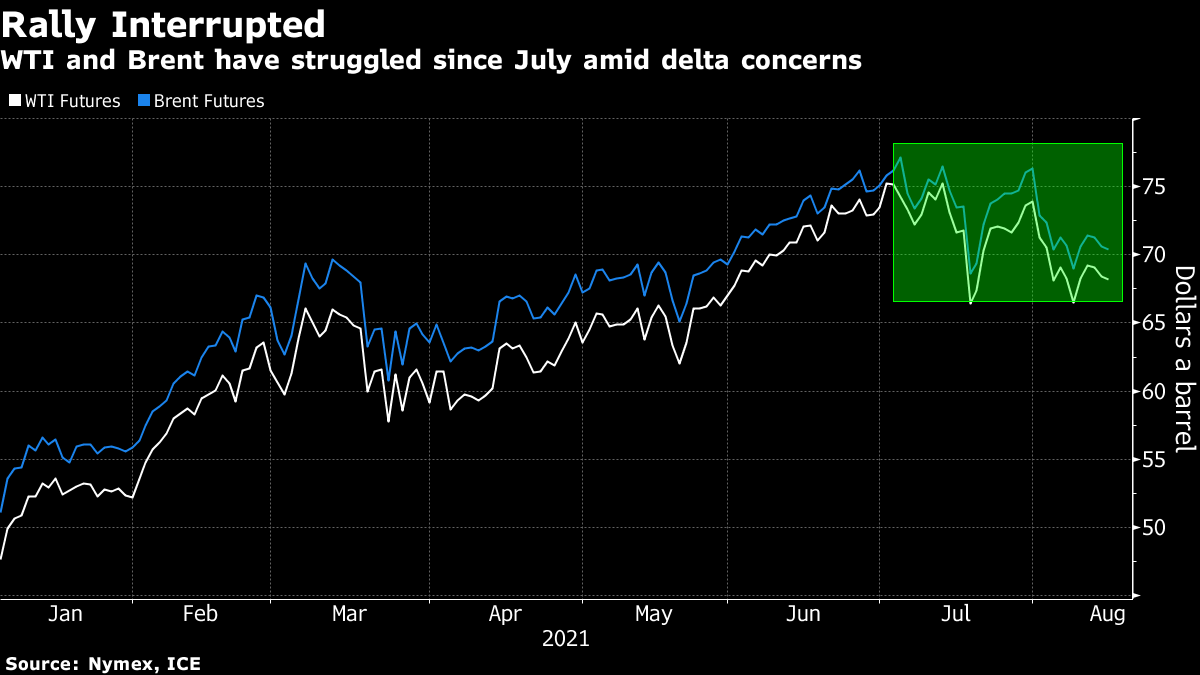 “The delta worries are tightening their grip on oil market sentiment,” said Vandana Hari, founder of energy consultant Vanda Insights, adding that the summer travel and tourism boom in the West is petering out. “The market will likely remain in flux, at least until the delta wave shows a significant and sustained retreat, especially in the U.S. and China.”