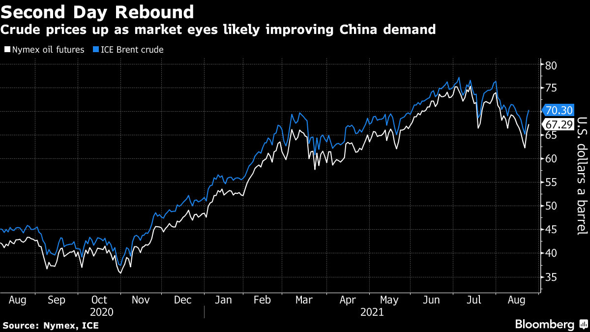 (Bloomberg) -- Oil prices in New York gained for a second session, building on the biggest one-day gain in nine months, amid glimmers of optimism among bulls that the delta coronavirus variant’s hit to demand may be passing.
