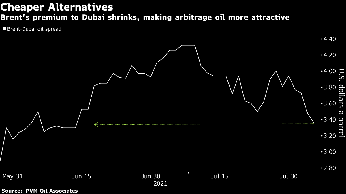 U.S. varieties such as Mars -- of a comparable medium quality -- are being offered at rates that are lower than last month, while Russia’s Urals is also becoming cheaper, according to traders who buy and sell those barrels. Brent’s premium to Dubai oil was at $3.38 a barrel as of early Friday, compared with $4.36 a month earlier.