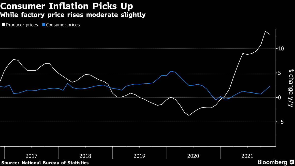 The producer price index rose 12.9% from a year earlier, above economists forecasts of a 12.1% gain, data from the National Bureau of Statistics showed Thursday. The consumer price index increased 2.3%, the fastest pace since August 2020 but below the projected 2.5% gain.