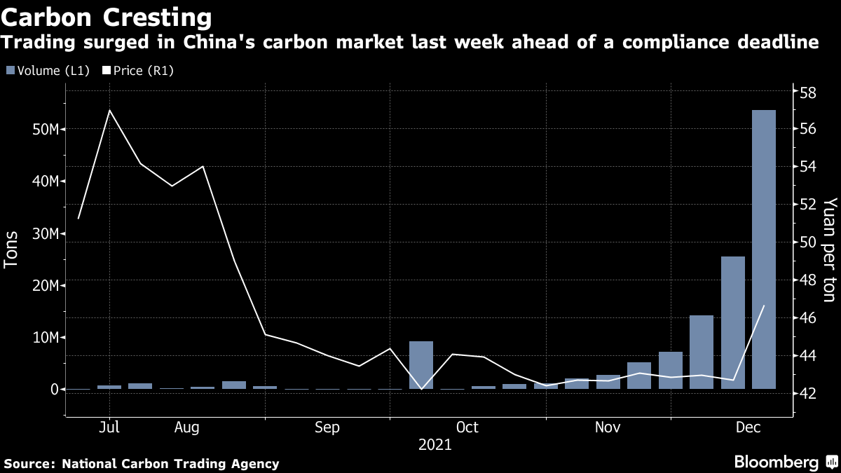 Trading activity in China’s fledgling national carbon market surged last week, with allowances for nearly 54 million tons of emissions changing hands ahead of a year-end compliance deadline. Still, pricing remains muted at 46.66 yuan ($7.32) a ton, compared to 81.3 euros ($91.36) in Europe.
