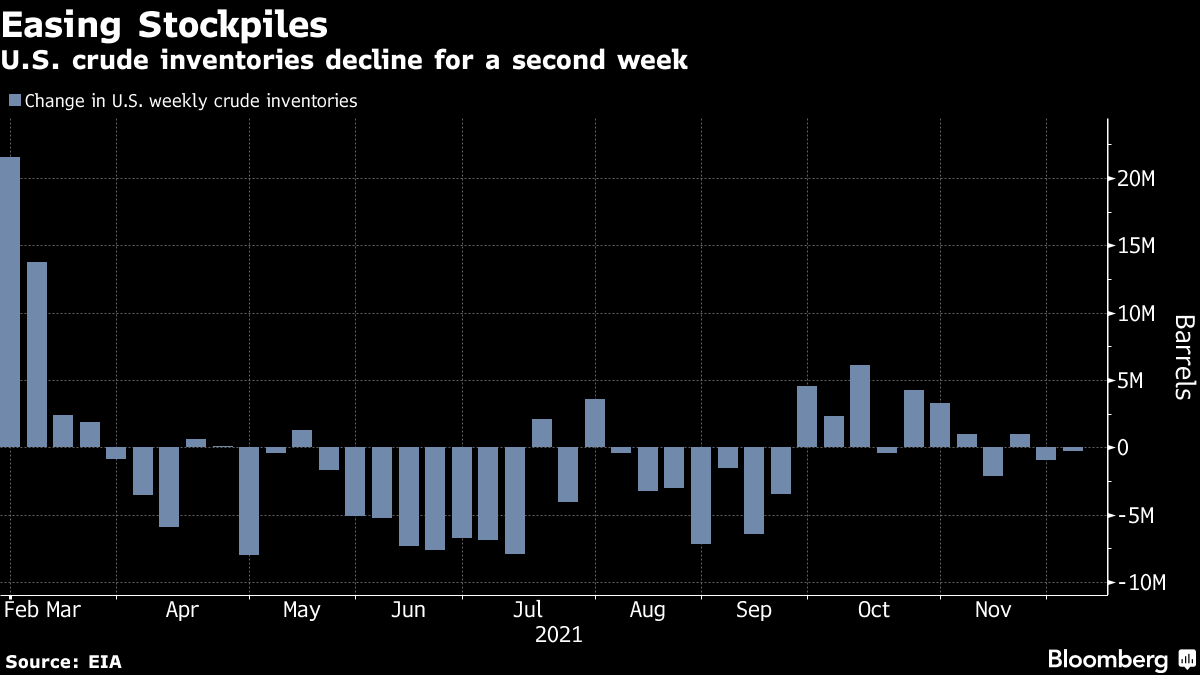 Oil has rebounded after falling for six weeks, in part due to major consumers signaling they would release strategic crude reserves to tame energy prices and the emergence of omicron. While demand hasn’t taken a big hit from the new variant, some nations have implemented restrictions on air travel and U.K. Prime Minister Boris Johnson has tightened pandemic rules.