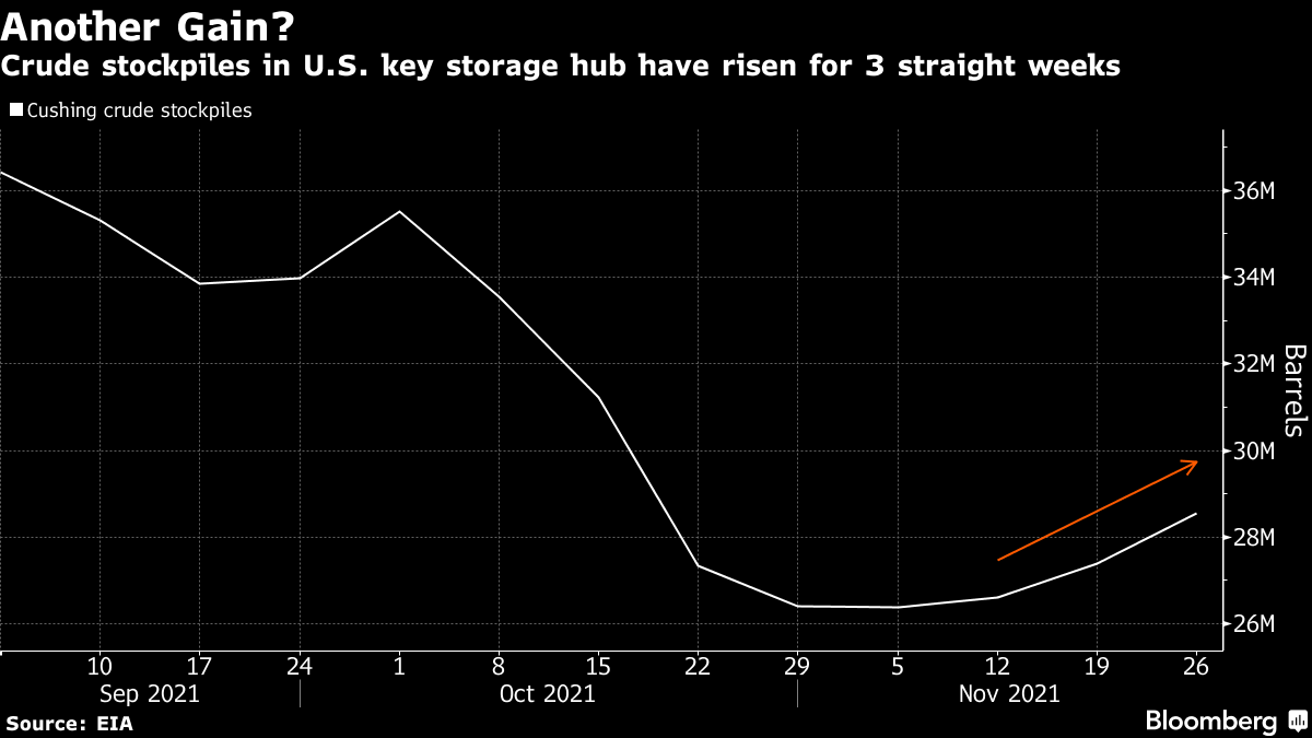 Crude has surged more than 8% over the past two sessions -- rising along with other financial assets -- on cautious optimism that the omicron virus variant is unlikely to derail the global economic recovery. There's few deaths from the new strain so far and little sign of a major impact on oil demand.
