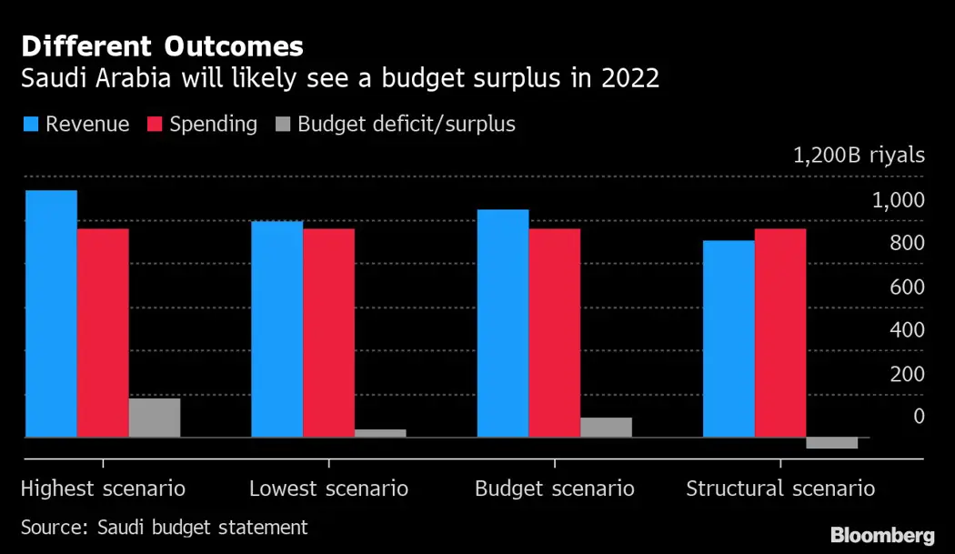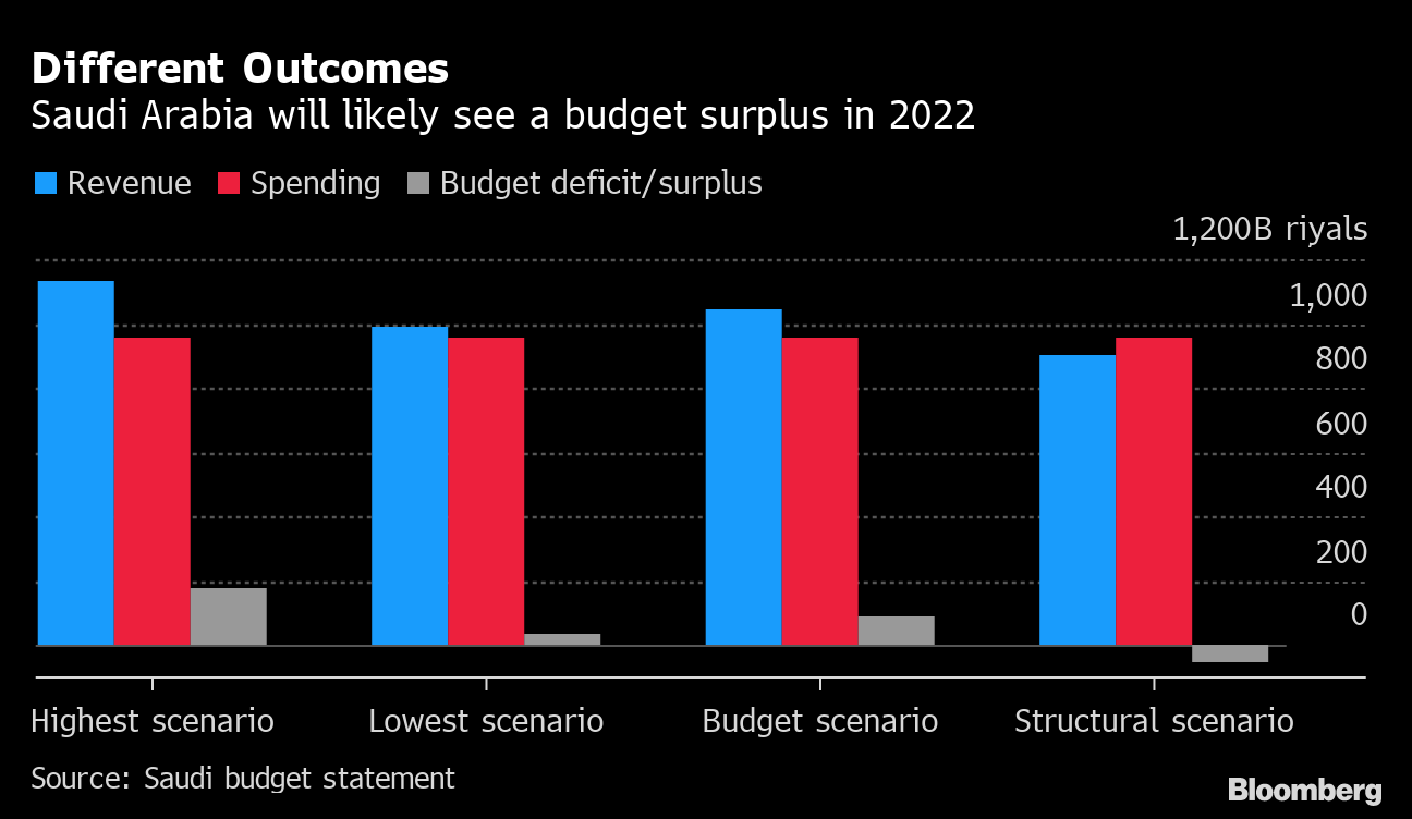 (Bloomberg) -- Saudi Arabia’s budget statement includes three different scenarios alongside its main projections for 2022, as the world’s largest oil exporter plots different revenue possibilities.