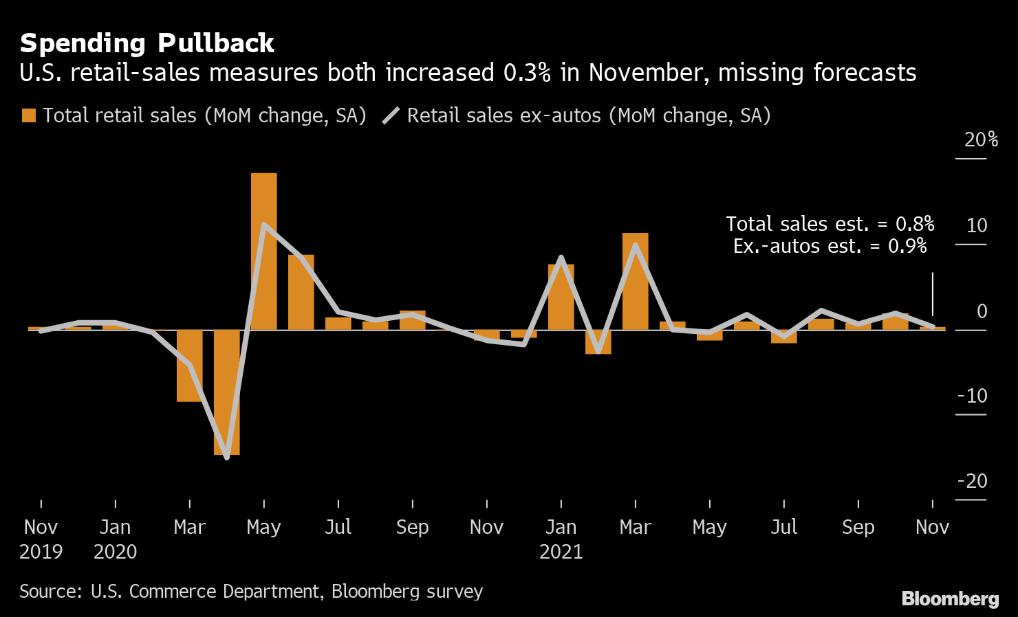 (Bloomberg) -- U.S. retail sales rose by less than forecast in November, suggesting that consumers are tempering purchases against a backdrop of the fastest inflation in decades.
