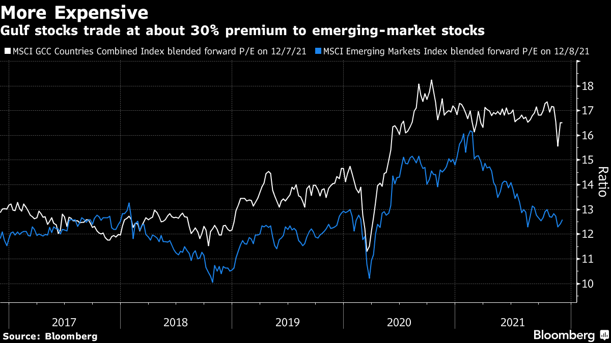 GCC markets -- with the exception of Qatar -- are expensive relative to other emerging-market oil exporters. The MSCI GCC Countries Combined Index is trading at about 16 times expected earnings in the next 12 months, a premium of 30% to emerging-market stocks. This compares with an average premium of 13% over the past 10 years.