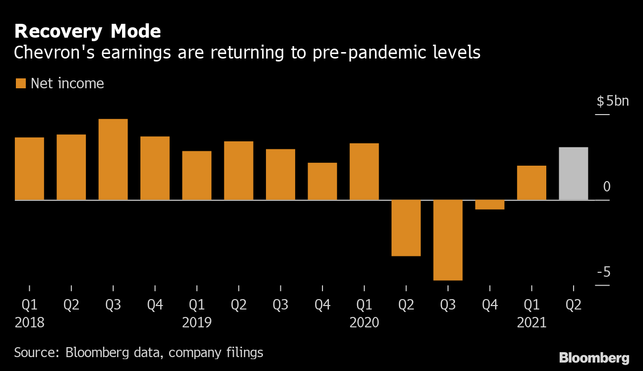 Chevron’s adjusted second-quarter profit was $3.3 billion, compared with a $2.9 billion loss a year earlier. The main profit drivers were higher oil and natural gas prices, while the company also benefited from a chemical boom and a rebound in U.S. refining. International refining still showed signs of weakness due to the pandemic.