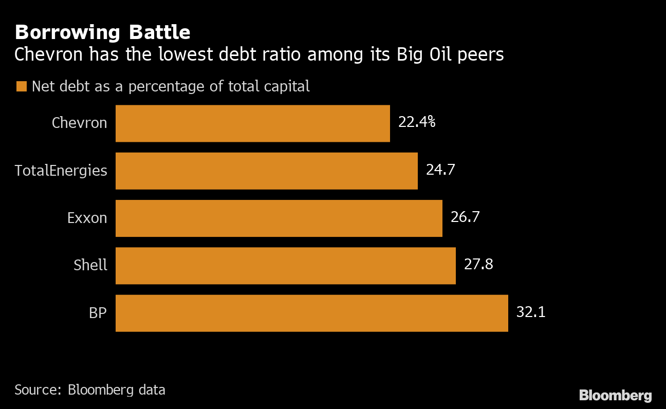 Even with recent increases, Shell’s and BP Plc’s dividends still lag pre-Covid-19 payouts. Exxon Mobil Corp. held its dividend steady earlier this week and is expected to devote excess cash to debt reduction rather than buying back shares. Key to Chevron’s strength is that it entered the pandemic in a stronger financial position than rivals, with a low debt burden.