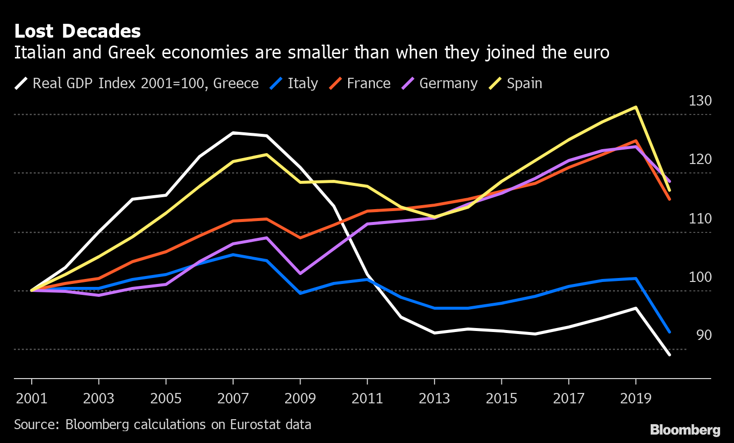 Then there’s also more recent damage to repair from the pandemic. Spain suffered a contraction of more than a 10th of output in 2020 alone. For Italy, cumulative damage from the coronavirus and years of government deadlock means real gross domestic product is lower than it was when it joined the euro.
