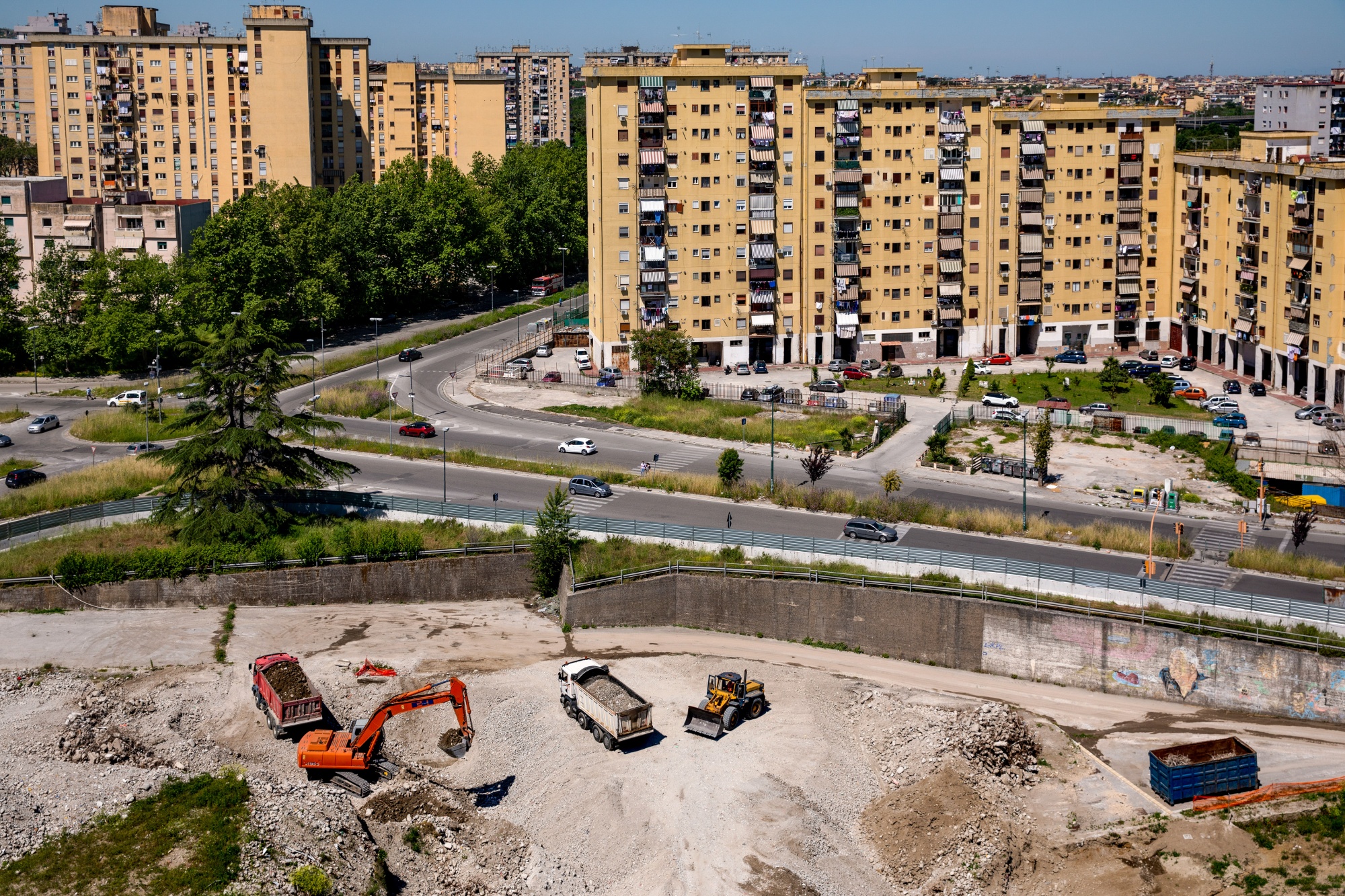 Workers remove debris from a housing estate demolished last year in Naples.