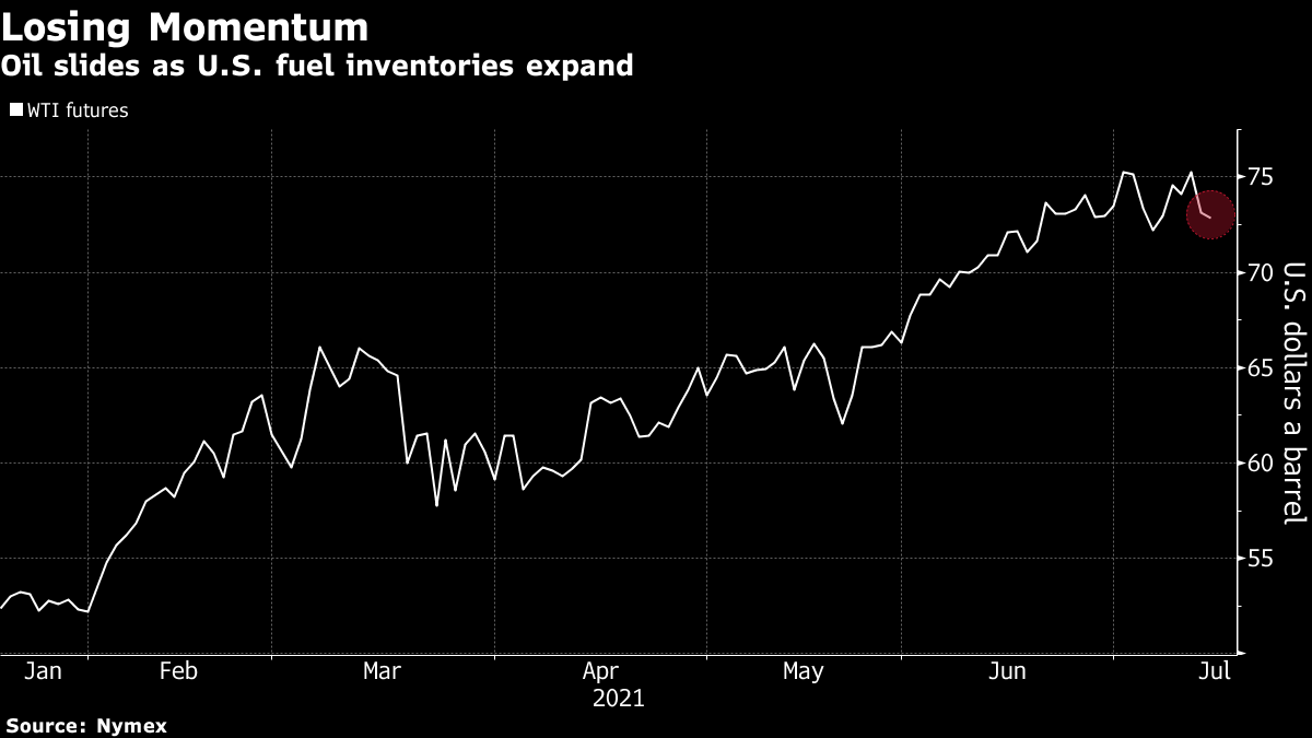 Futures in New York slid below $73 a barrel after falling 2.8% on Wednesday, the most since mid-May. American inventories of gasoline and distillates -- a category that includes diesel -- both rose last week, offsetting an eighth weekly draw in crude stockpiles, according to government data.