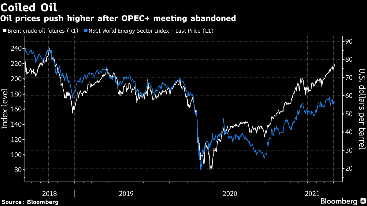 The surprise breakdown in talks means tighter supply conditions for crude and upward pressure on prices -- at least in the near term -- adding fuel to the wider inflationary concern that’s challenged central banks and roiled risk assets. Brent crude futures rose above $77 for the first time since 2018 this week, sending global energy shares higher.
