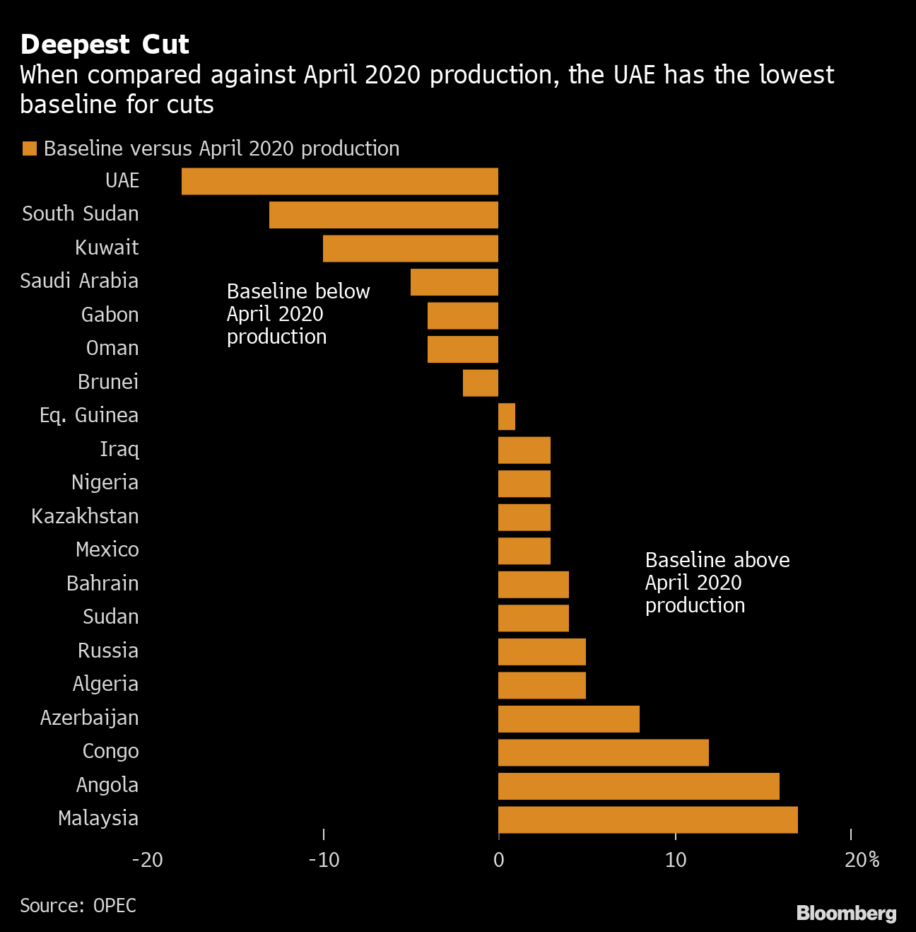 At the center of the dispute is a word key to OPEC+ output agreements: baselines. Each country measures its production cuts or increases against a baseline. The higher that number, the more a country will be allowed to pump. The UAE says its current level, set at about 3.2 million barrels a day in April 2020, is too low, and says it should be 3.8 million when the deal is extended into 2022.