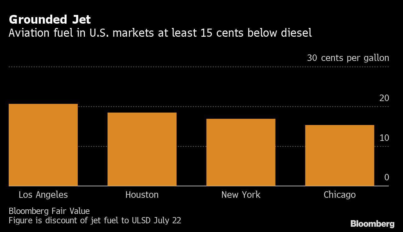 (Bloomberg) -- The U.S. is swimming in so much jet fuel that even this summer’s surge in air travel can’t save the market.
