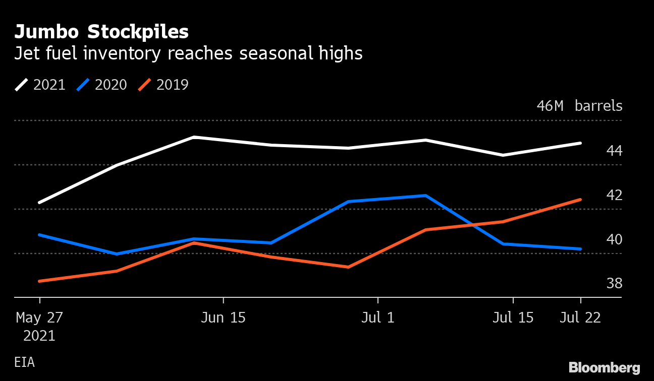 Air traffic in the U.S. has jumped to more than 2 million passengers a day, about 78% of where it was in the summer of 2019, according to the Transportation Security Administration. That’s done little to diminish the massive glut in jet fuel stockpiles, which stand at their highest seasonal level in a decade. Part of the problem is that refiners are trying to cash in on resurgent gasoline demand by raising production rates, which indirectly leads to more jet fuel output.
