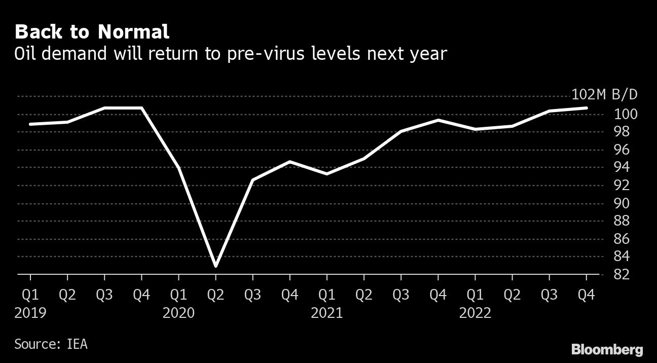 (Bloomberg) -- Global oil demand will recover to pre-pandemic levels late next year, the International Energy Agency predicted, urging OPEC and its allies to keep markets balanced by tapping their plentiful spare production capacity.
