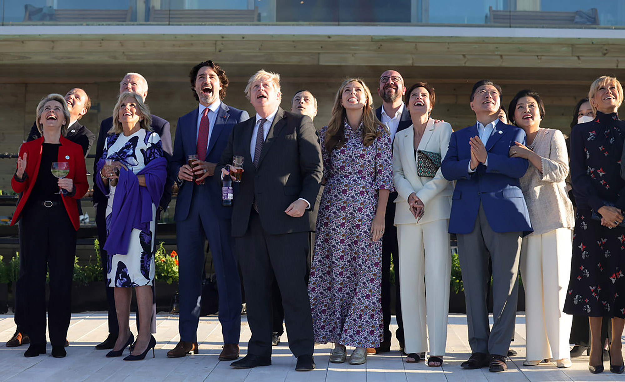 Boris Johnson joined by G-7 Leaders as they watch the Red Arrows flying display at the summit in Carbis Bay, June 12.