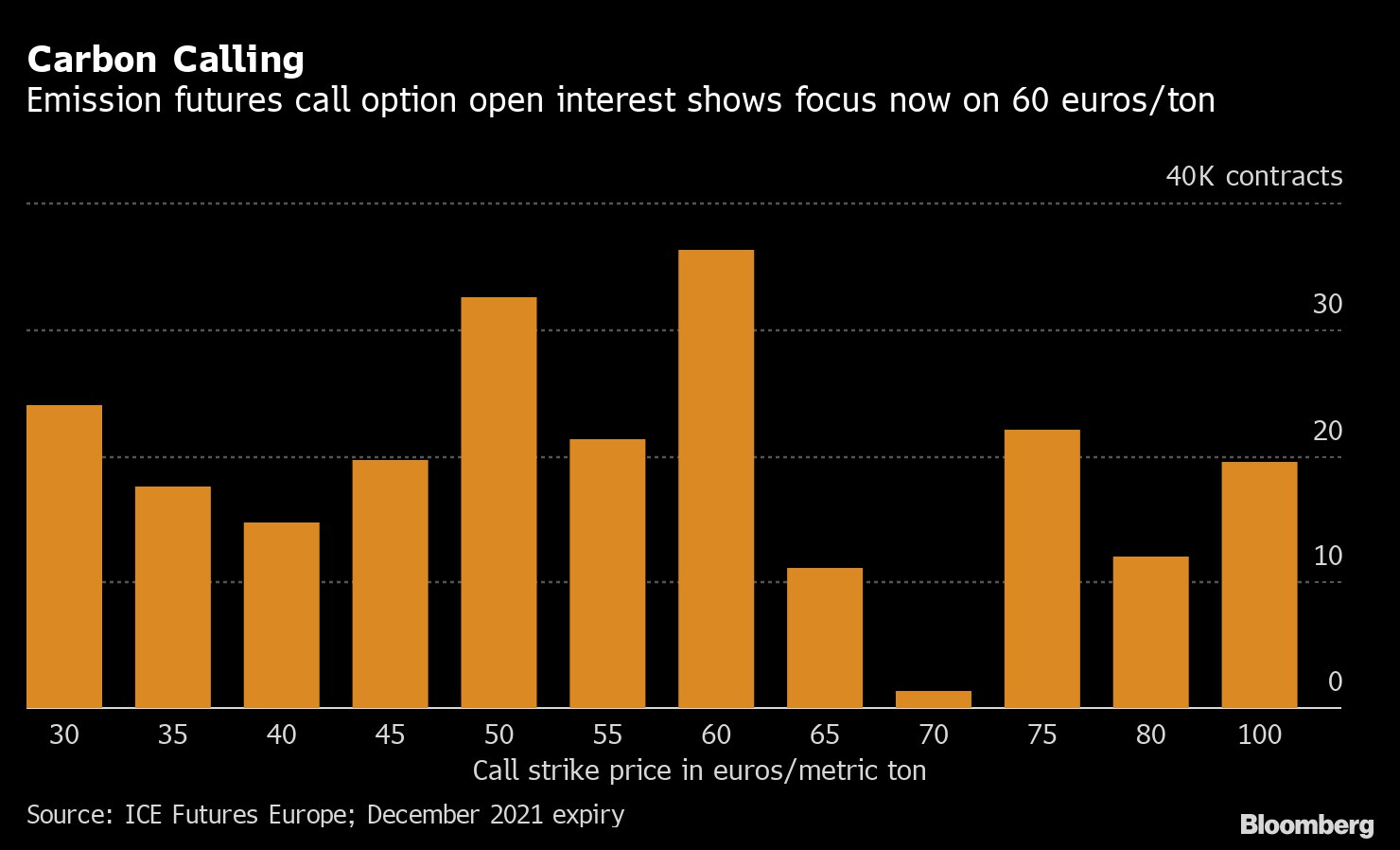 Options traders are anticipating even higher prices. Calls to buy European Union emission permits at 60 euros per ton, or about 20% above the prevailing market rate, now have the highest open interest on the ICE Futures Europe exchange.