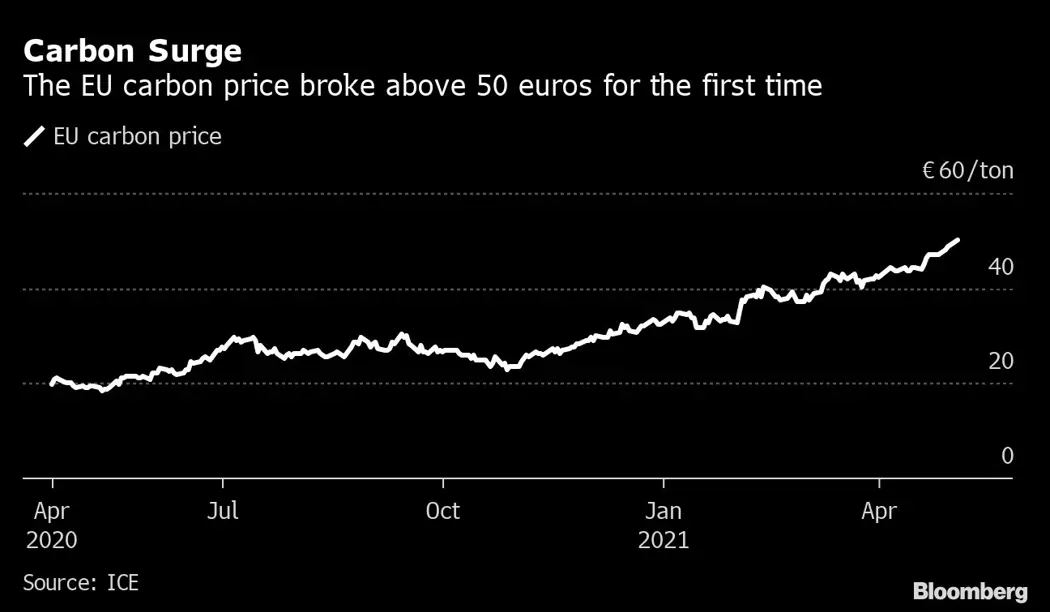 Futures in the region’s carbon market, the world’s biggest, exceeded 50 euros ($60) per metric ton for the first time on Tuesday. Rising prices make it more expensive to release carbon dioxide into the air and force industry to look for cleaner ways to stoke their furnaces and keep the lights on.