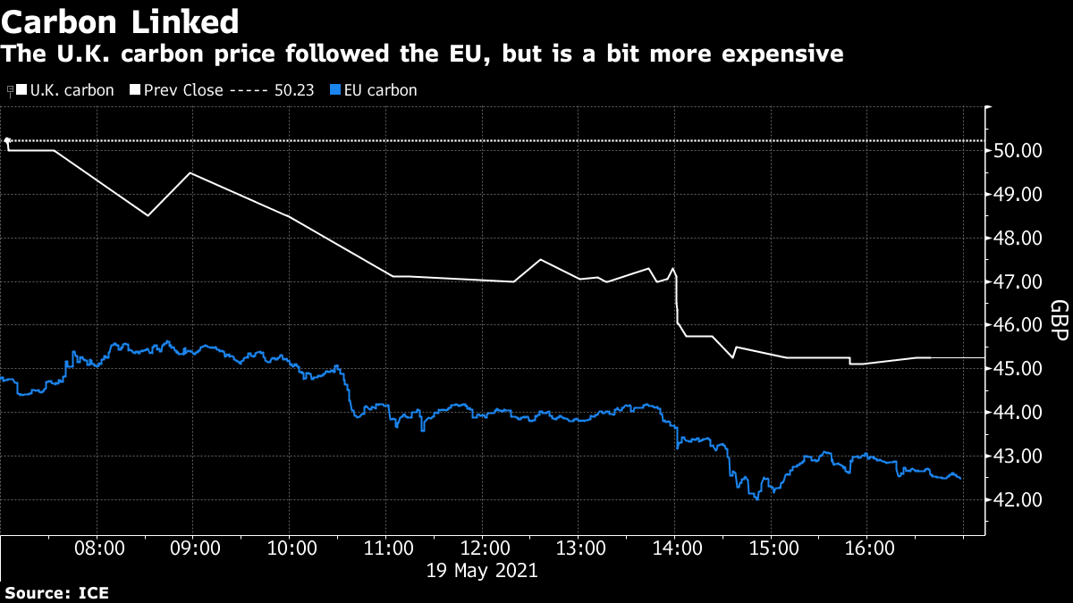 The government has given itself greater ability than the EU to meddle in the market during its first years. Three months of elevated prices would trigger intervention, compared to 6 months for Brussels. The U.K. could also take action to alter the supply of permits. The current threshold for government intervention is 44.74 pounds in the futures market, 51 pence below Wednesday’s closing price.