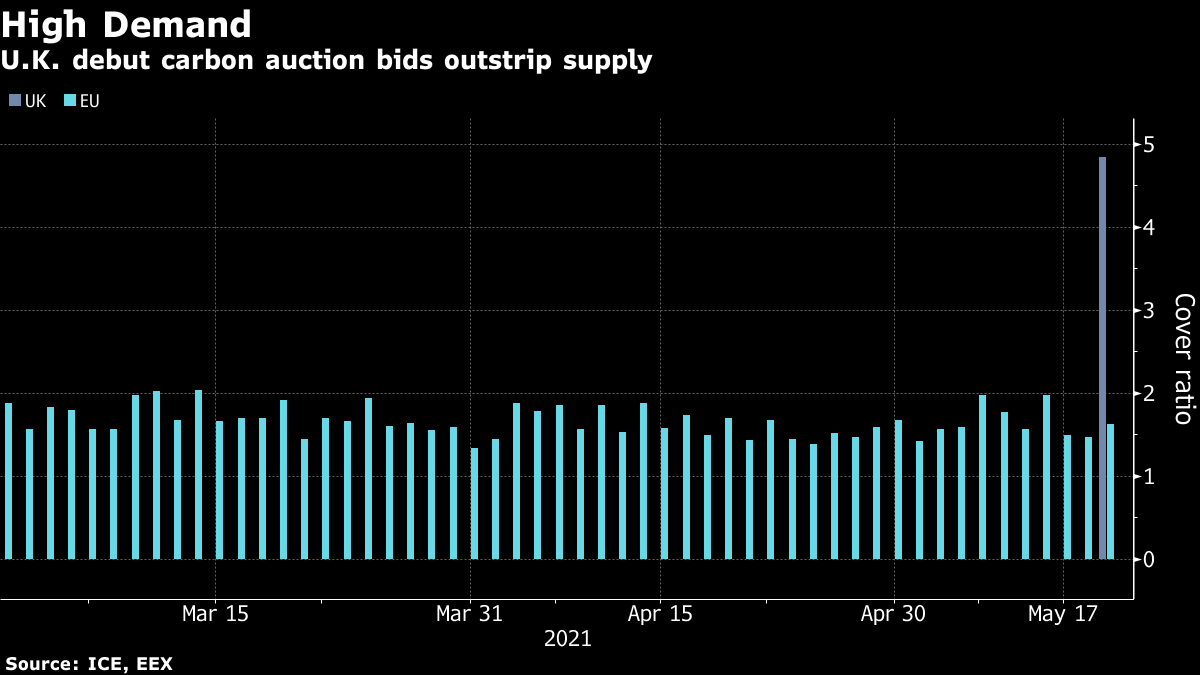 ”Today’s first U.K. emissions trading system auction is a major milestone in delivering our goal to clean up our energy system, support businesses to decarbonize at the least cost and drive forward the green industrial revolution,” said U.K. Energy Minister Anne-Marie Trevelyan. “At every step of the way, we will protect the competitiveness of British industry and minimize risk of carbon leakage as we transition to a green economy.”