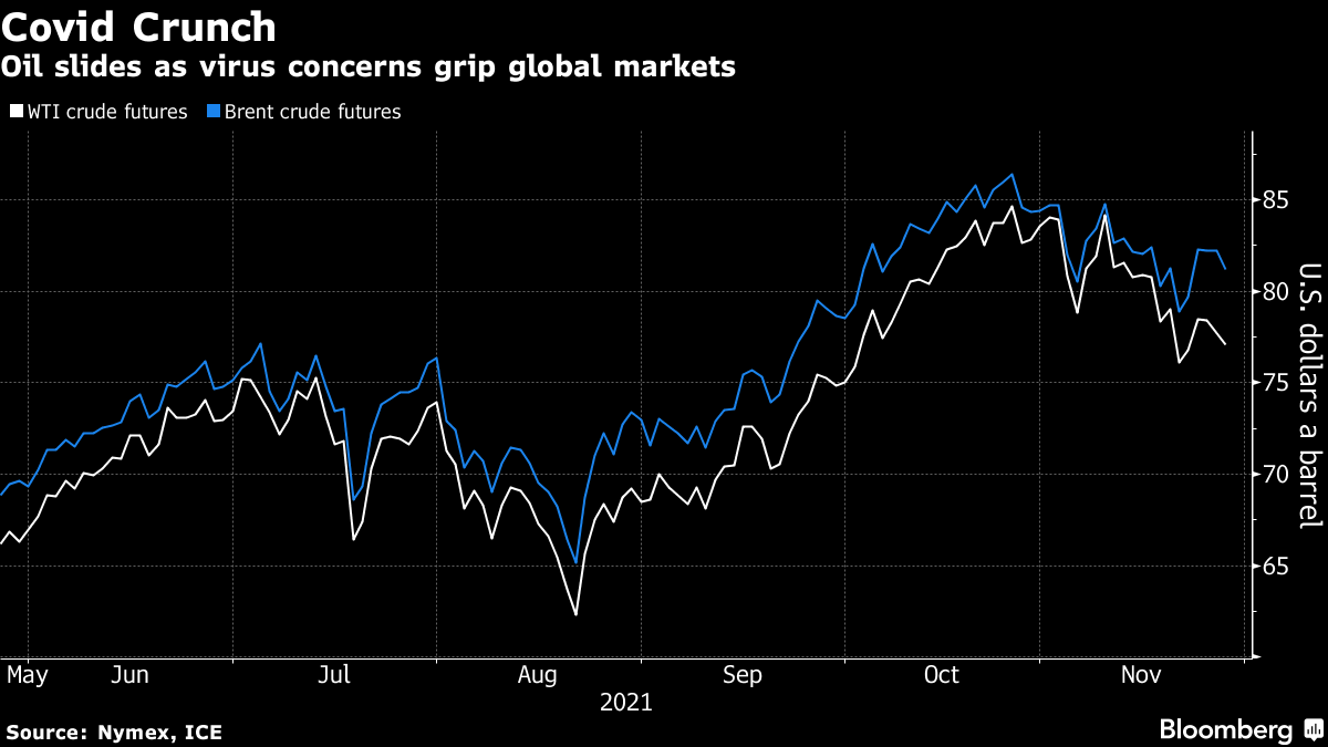 Futures in London slid toward $80 a barrel as crude was swept up in a wave of caution across global markets. Virus cases are climbing in Europe and the U.S., while U.K. authorities will temporarily ban flights from some southern African countries and put travelers in quarantine over worries about the new strain.