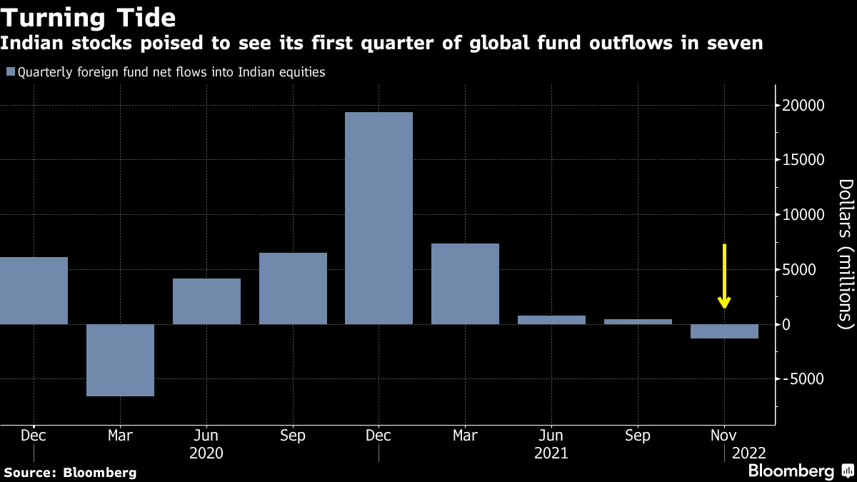 Sentiment toward new listings has also soured after digital payments startup Paytm, India’s largest initial public offering, flopped in its debut on concerns over pricey valuations. Foreign funds are also selling, having withdrawn $1.3 billion this quarter, compared with inflows of $8.5 billion over the first nine months of 2021.