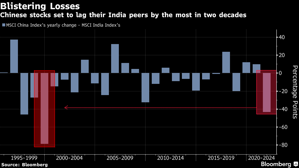 “There is more opportunity to allocate to China as the performance disparity between the two countries is one of the largest on record,” said Tom Masi, a New York-based portfolio manager with GW&K Investment Management LLC, who recently trimmed his India positions.