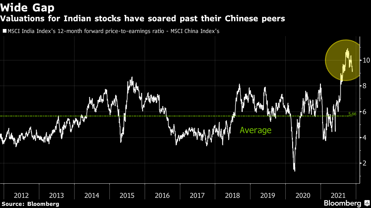 Valuations are the key rationale as the losses triggered by Beijing’s wide-ranging regulatory crackdown have made Chinese equities relatively cheap, while shares in the South Asian nation appear expensive after a world-beating rally.