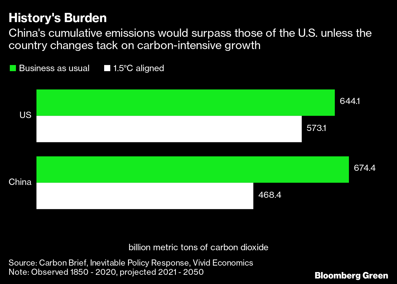 That posture reflects China’s long-held position that its emissions should be judged against the historical pollution from major economies that industrialized first such as the U.S. and U.K. But that line is ringing less and less true as China’s economy booms and its toll on the warming planet continues to accelerate. In less than three decades, China’s cumulative carbon-dioxide emissions will exceed those of the U.S., according the Inevitable Policy Response project, if things continue on the same path. By mid-century, in other words, China will become the biggest emitter in history if it doesn’t do more to curb its pollution now.