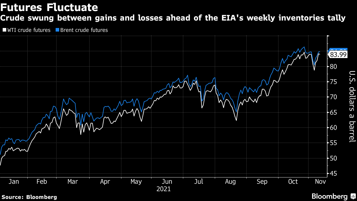 (Bloomberg) -- Oil fluctuated between small gains and losses in choppy trading ahead of the U.S. government’s weekly inventory tally.
